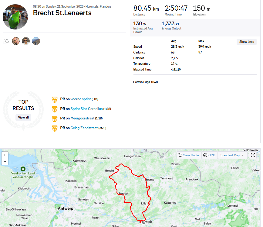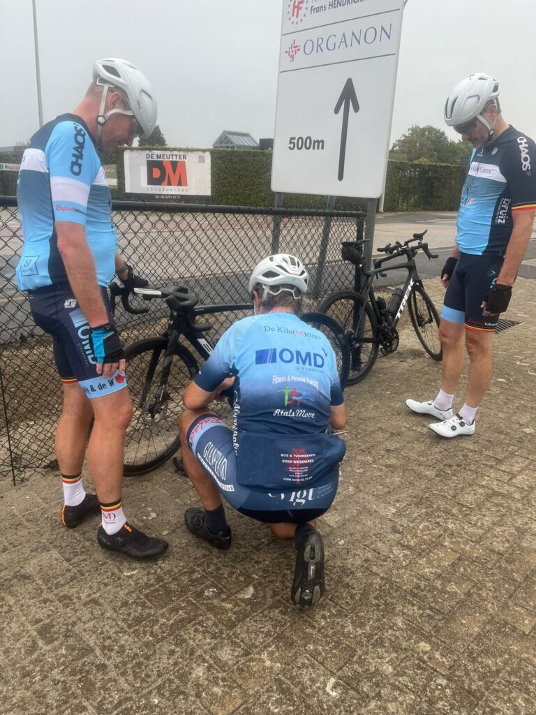 Nu misschien iets over de rit: perfect op tijd vertrokken met enige twijfel om met de A’s mee te rijden en juist op tijd gecorrigeerd om ons geplande rit naar Brecht te rijden ondanks met veel wind en maar met 5. Zoals eerder vermeld al na 8 km platrijden en zorgen dat we op tijd zijn voor de loempia’s.