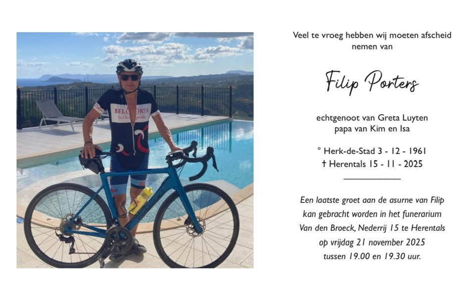 Met grote droefheid melden wij het heengaan van onze Filip Porters ( aka: Filippo Polzato). Dit is de droevigste dag ooit in ons club bestaan en raakt ons allen zeer diep. Filip zal in onze harten altijd mee blijven rijden. Via deze weg willen wij als club sterkte wensen aan Greta en Familie van Filip